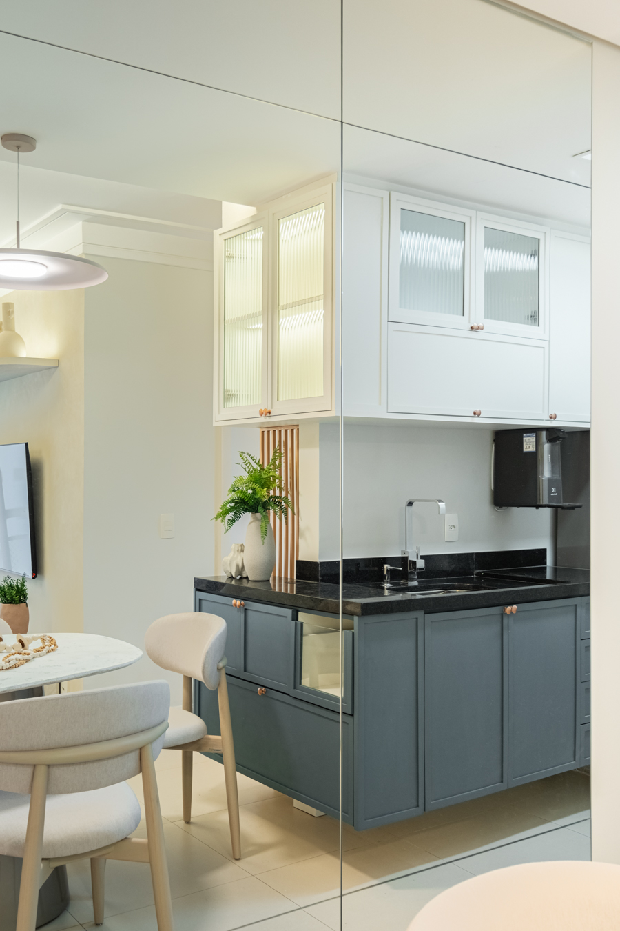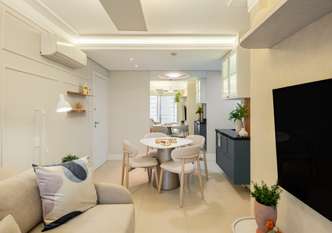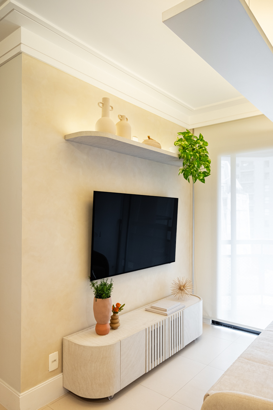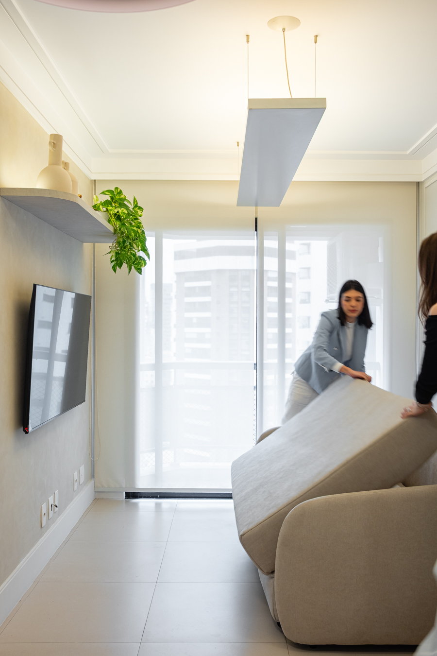 Neste studio de 33m², desenvolvemos um projeto clássico, funcional e atemporal, equilibrado pela estética clean desejada pela cliente. O banheiro foi totalmente reformado, enquanto os demais ambientes foram transformados por meio de marcenaria, mobiliário solto e decoração cuidadosamente selecionados.